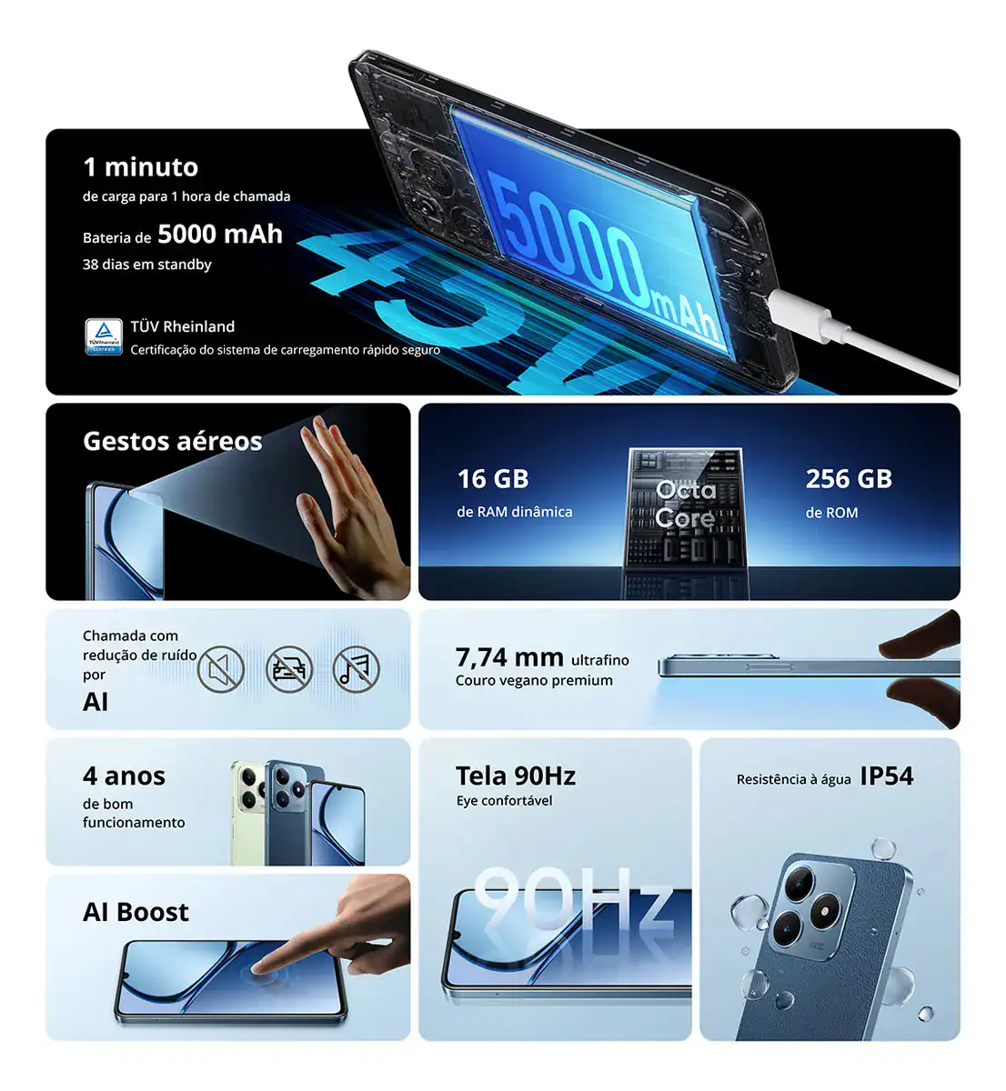 Realme C63 – 6GB RAM + 6GB RAM Dinâmica (total até 12GB) / 128GB